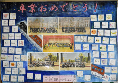美術部員が3年生への感謝と応援の気持ちを込めて制作した「卒業お祝いメッセージ」が完成し、被服室前に掲示されました。