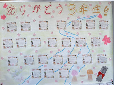 3年生の教室前の廊下は、今、感謝とエールが詰まったメッセージカードで彩られています。1・2年生の各クラスが作成した掲示物には、部活動や委員会でお世話になった先輩一人一人への感謝の言葉や、「高校へ行っても頑張ってください!」という力強いメッセージがびっしりと綴られています。