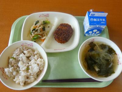 令和7年度最後となる給食の時間を迎えました。本日の献立は、鶏ごぼうごはん、わかめと玉ねぎのみそ汁、キャベツメンチカツ、野菜のおひたし、牛乳です。