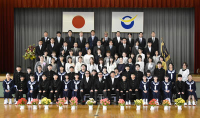 1年1組・1年2組、それぞれの新しい旅立ちを祝して記念撮影を行いました。